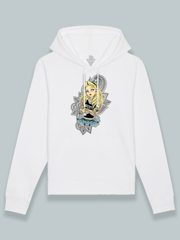 Bolsillo canguro, manga pegada, capucha forrada con punto de jersey, cordón redondo del mismo tono. Ojales de la capucha cosidos, Bies interior de espiga en el cuello, media luna interior en tejido principal.