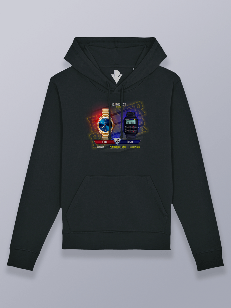 Canalé 1×1 en puños y bajo, puntada plana en todas las costuras, bolsillo canguro con sobrecostura.